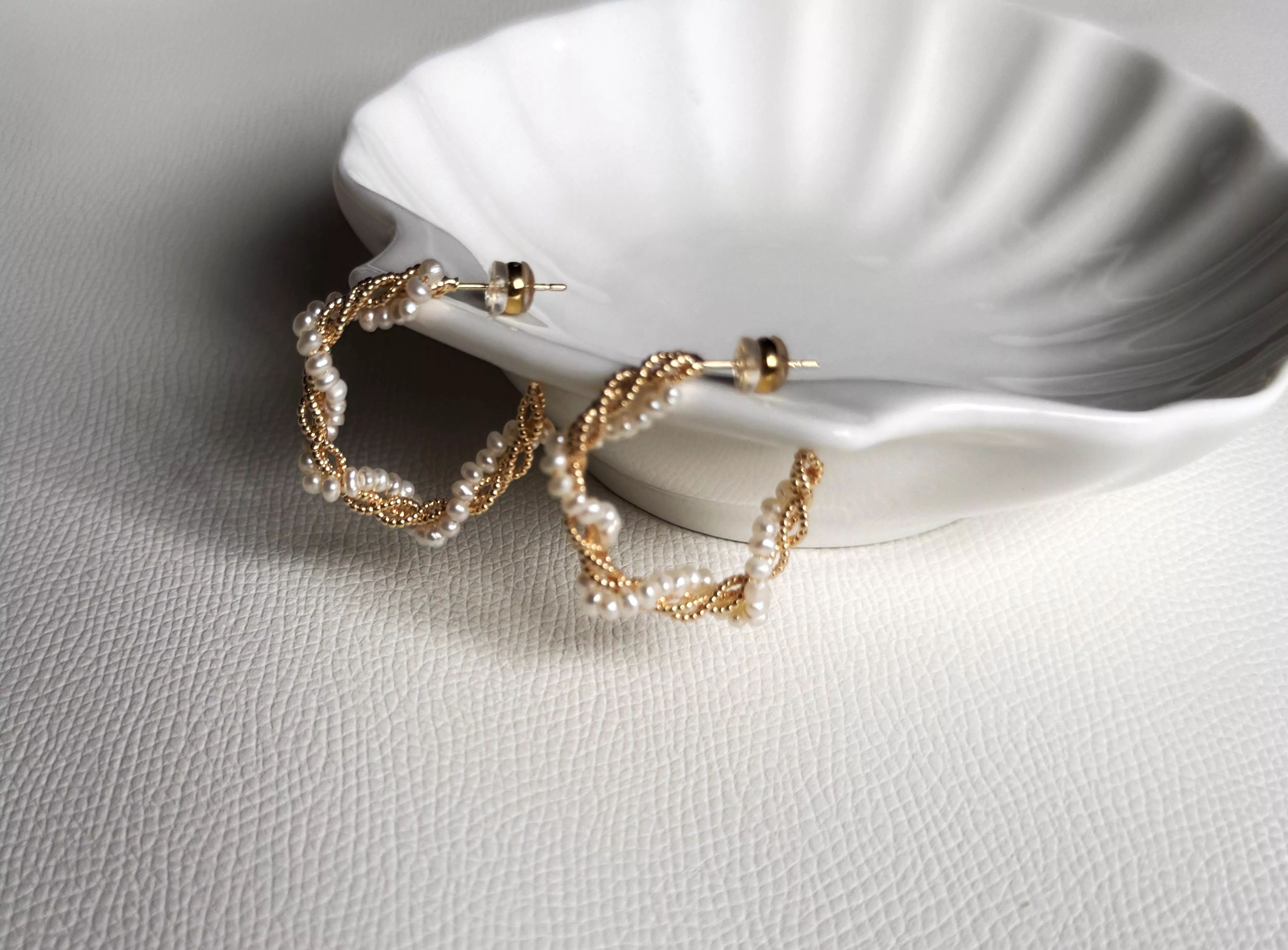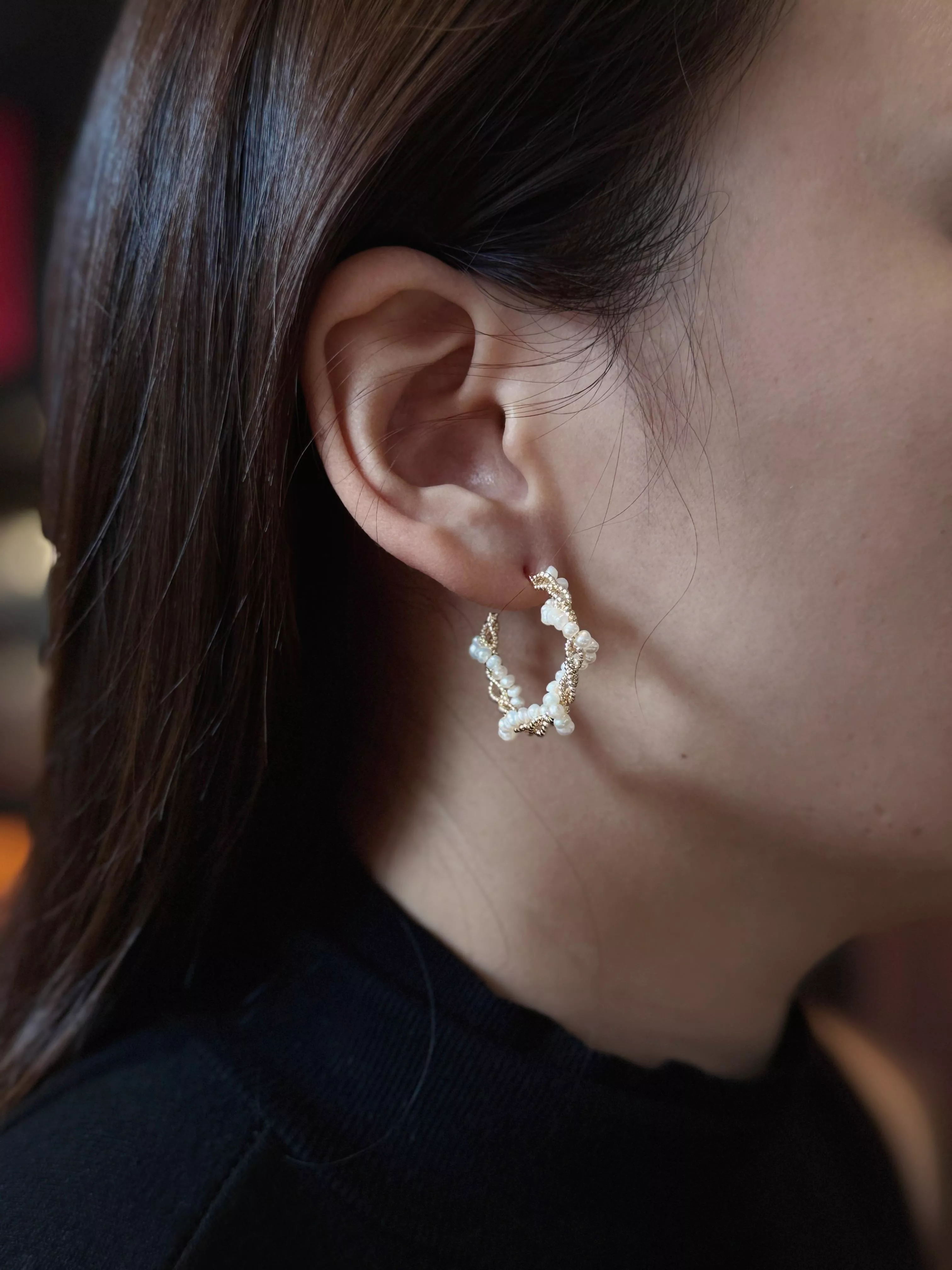 以細緻淡水珍珠手工串連出溫柔的弧度,