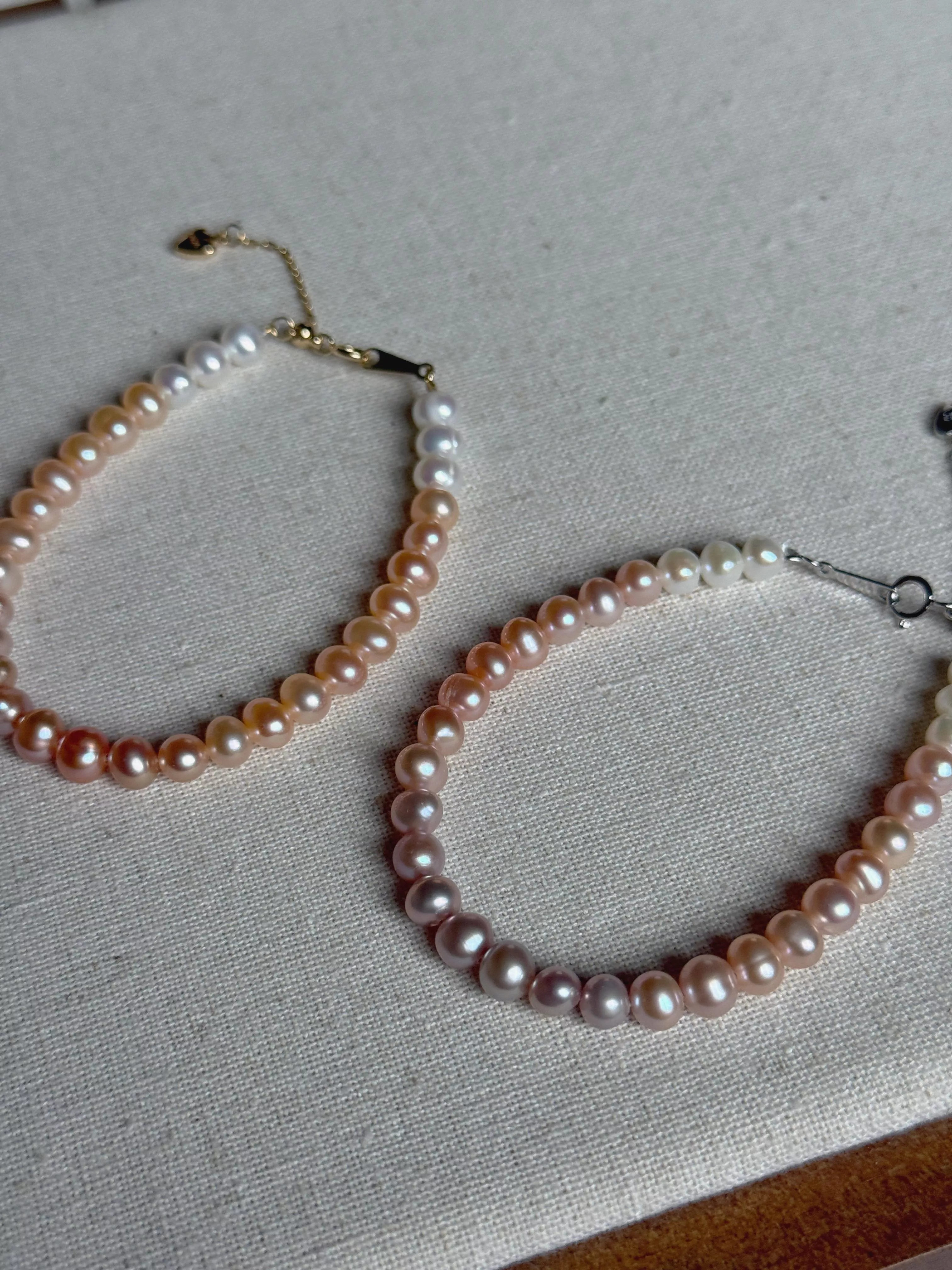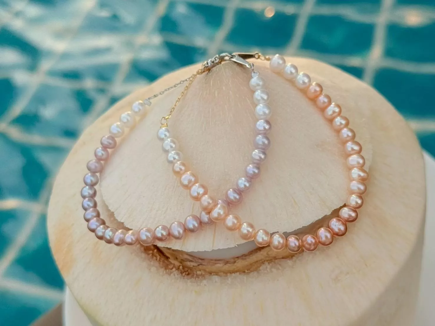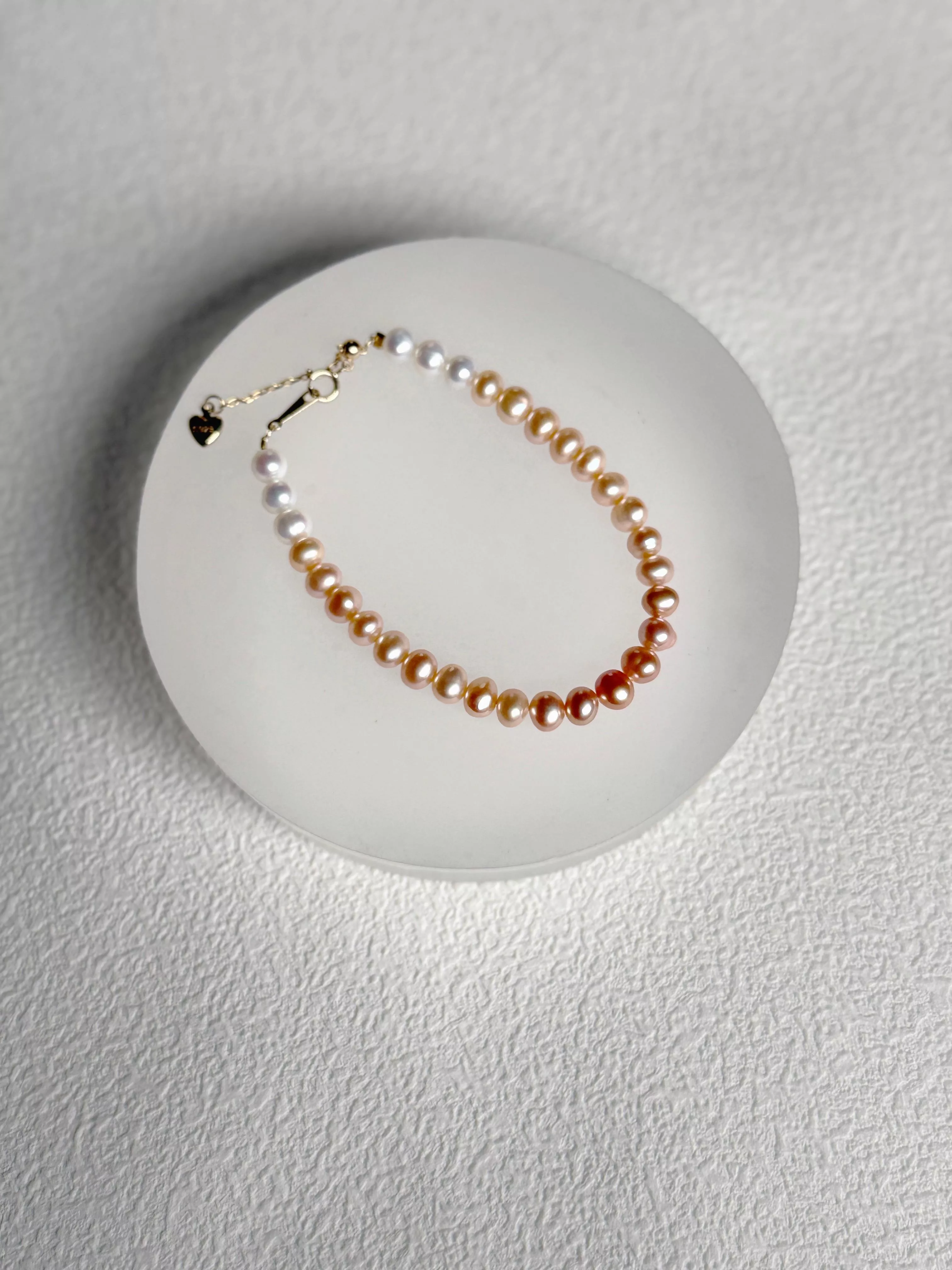 利用珍珠天生的皮色光澤,由淺至濃排列,