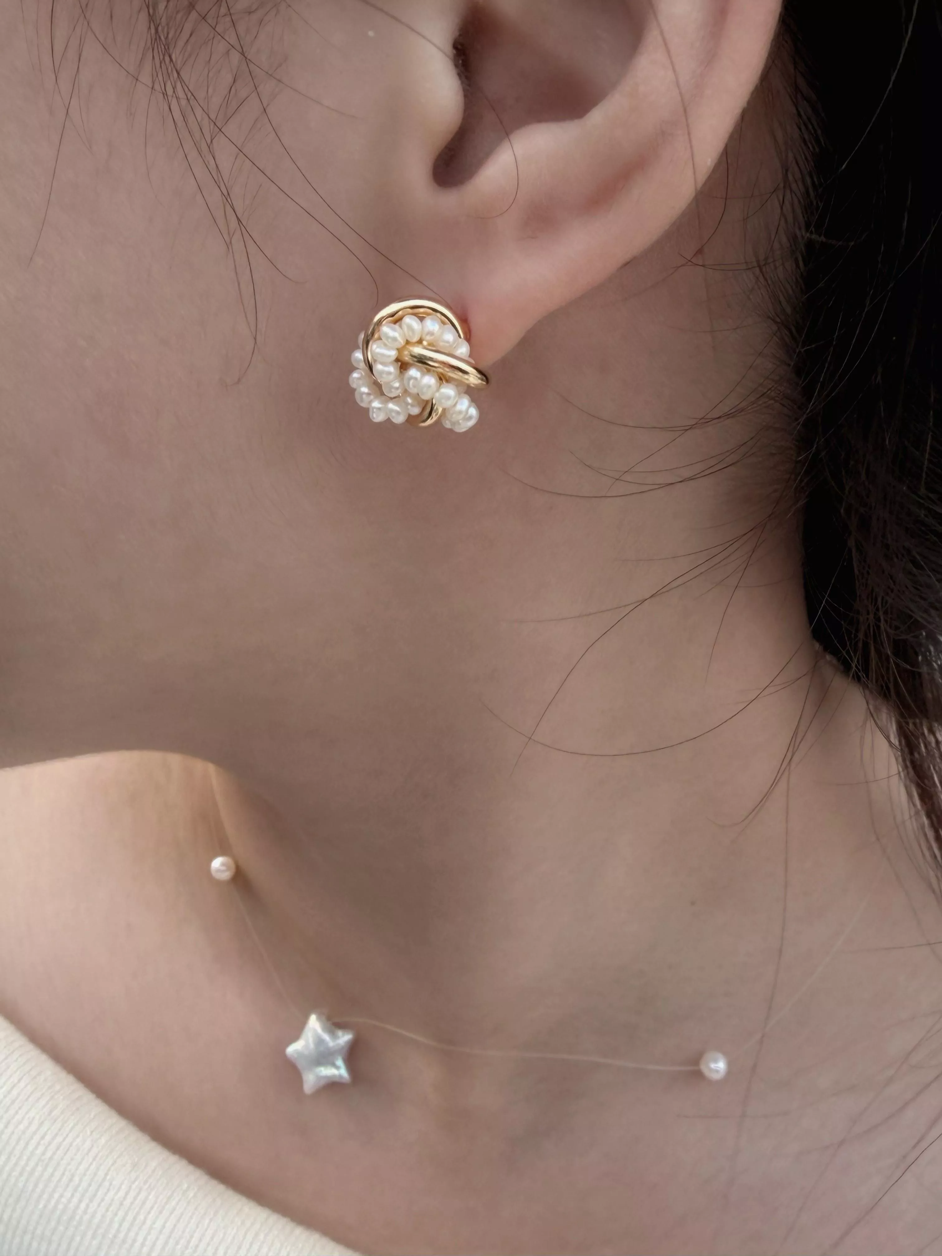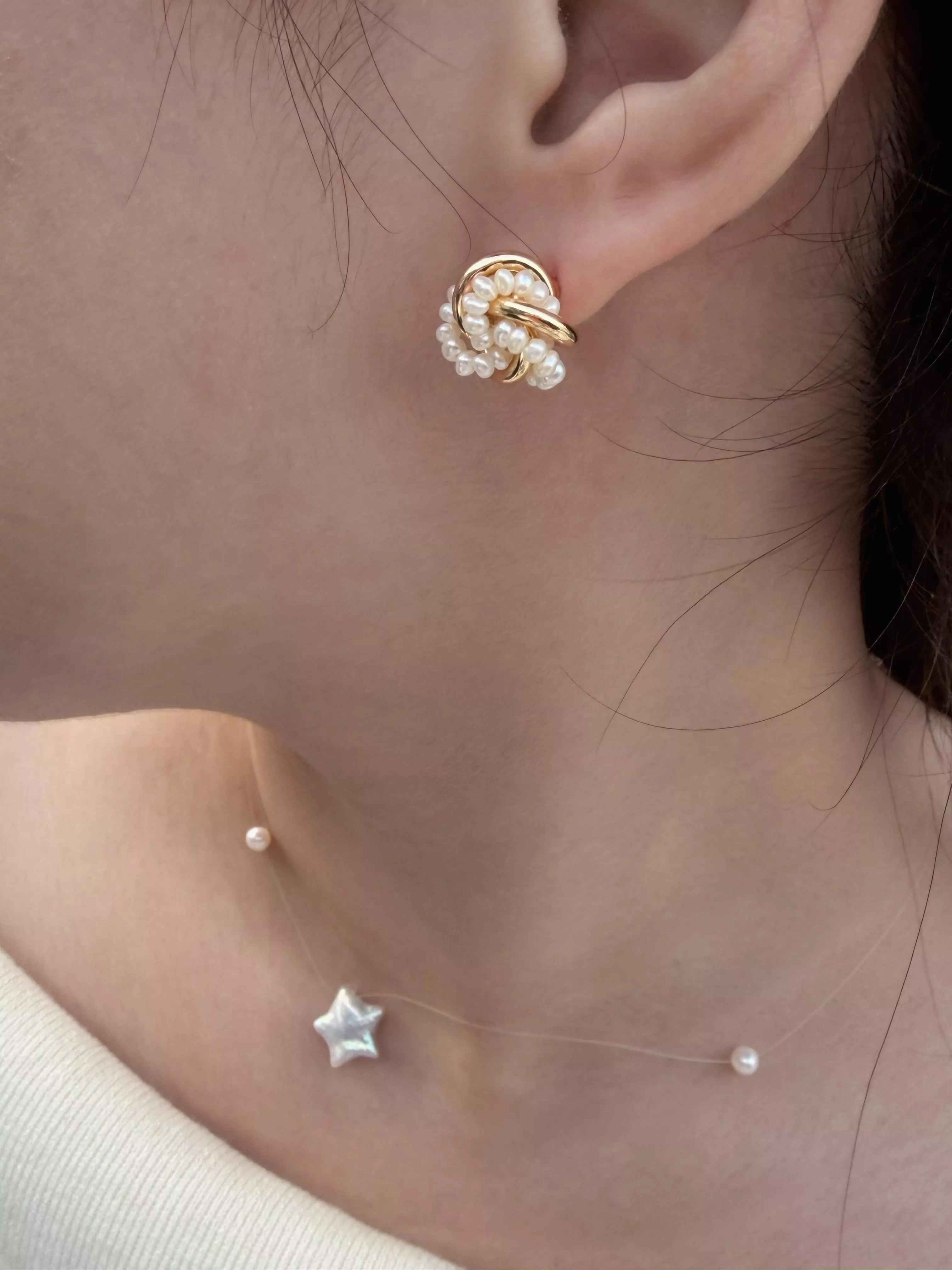 材質:淡水珍珠、925銀針金屬與珍珠的纏繞,是微醺時思緒的浪漫交集。適中的份量感能完美修飾臉型,讓妳在新年走春或日常穿搭中,都能展現出一種「剛柔並濟」的女性精緻感。